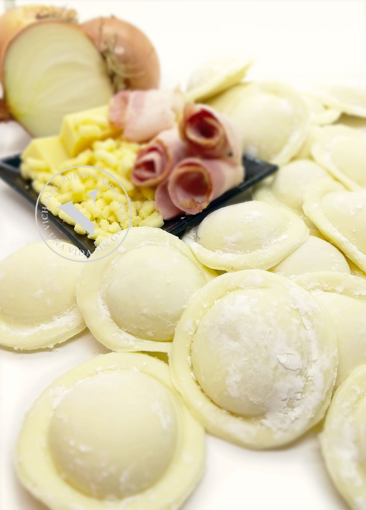 Sorrentinos de Osobuco Braseado con masa doble yema LIBRES DE GLUTEN, conformados en base a premezcla propia. Contiene huevo y derivados de leche