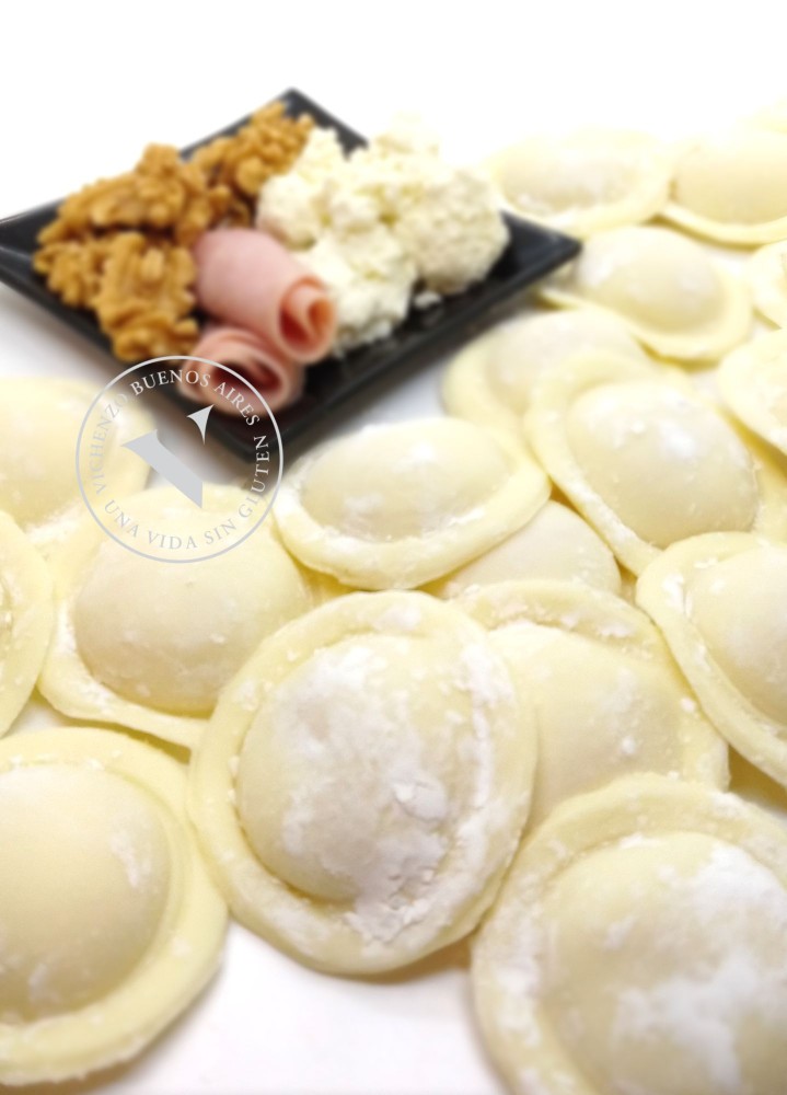 Sorrentinos de Ricota, Jamón y Nuez LIBRES DE GLUTEN, conformados en base a premezcla propia. Contiene huevo y derivados de leche